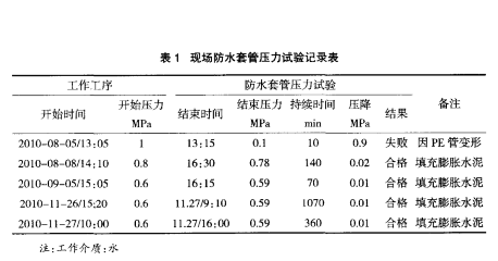 經(jīng)過一個月的反復(fù)試壓試驗,套管沒有再發(fā)現(xiàn)滲漏現(xiàn)象,試壓成功。現(xiàn)場防水套管壓力試驗記錄數(shù)據(jù)詳見表1。