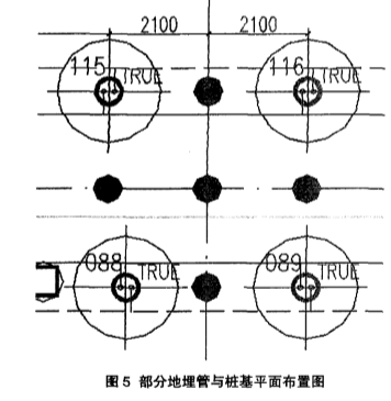 供、回水分別集中到單獨的分、集水器上。水平聯(lián)絡(luò)管采用De63、De75PE管,整個土壤換熱器系統(tǒng)按同程方式連接,確保各換熱孔內(nèi)循環(huán)液的流量、流速一致,為系統(tǒng)的安全運行提供可靠的保障。部分地埋管與樁基平面布置如圖5所示。